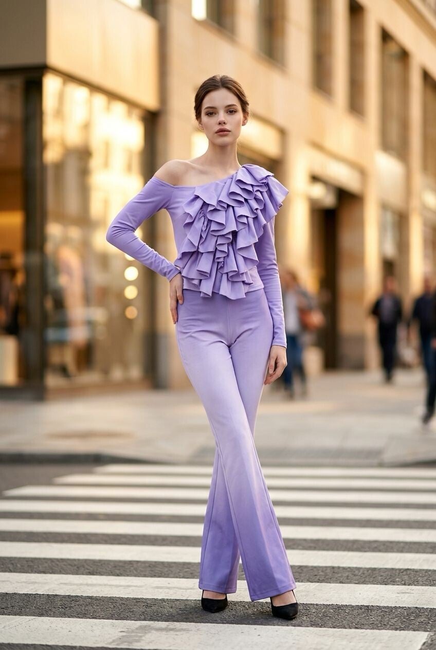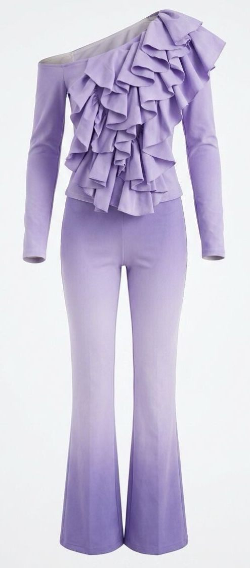 Jumpsuit monospalla a maniche lunghe e pantalone Straight fit, caratterizzata da una cascata di rousche sul davanti.