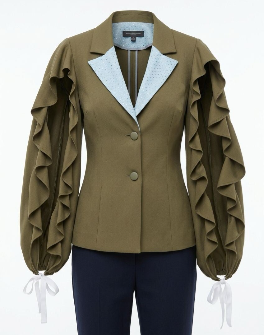 Blazer foderato, monopetto con collo a bavero e maniche rousche aperte regolabili tramite laccio coulisse al polso.
